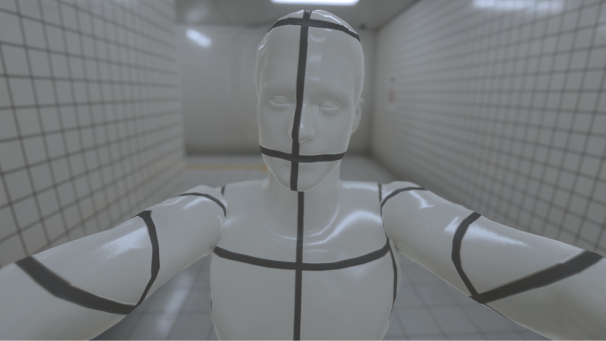あと、壁から出てくる人間にはアンリアルエンジンの「Scanned 3D People Pack」を使い、壁に馴染むようにマテリアルやテクスチャを作って適用しました。移動モーションはUnreal Engine 5の女性マネキンの歩行モーションで、抱きついてくるアニメーションは自作です。