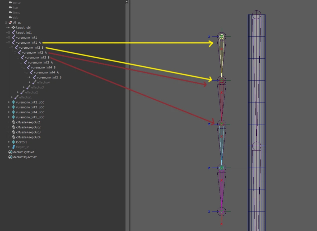 実装手順としては、各ジョイントにIK・ロケーターを設定し、それぞれのロケーターに「cMuscleKeepOutノード」を作成したのち、オフセットの挙動を制御するロケーターを追加。コリジョン用のサーフェスがcMuscleKeepOutを配置したポイントに接触すると、自動的に回避するように設定します。