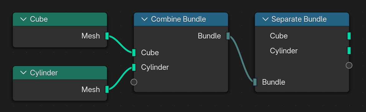 「Bundle Node」の使用例。CubeとCylinderのメッシュデータが統合され、1つの「Bundle」として受け渡されている(画像はDeveloperポータルの記事より引用)