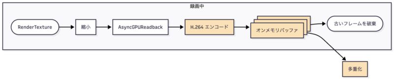 「リアルタイムモード」では、フレームをH.264形式・音声をAAC形式で圧縮することで録画データ容量を削減し、オンメモリでの保存を可能としています。