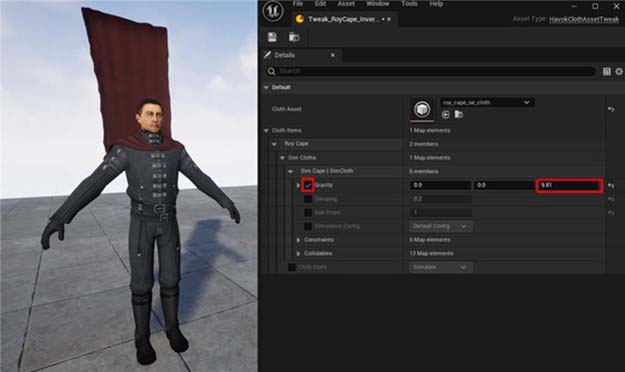 新規搭載された「Cloth Tweak Asset」を用いて、マントにかかる重力の影響を調整している様子(画像はHavok公式ブログより引用)