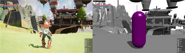 通常のレベル(画像左)と、物理エンジンが認識しているレベルの状態を「XRay View」で可視化した様子(画像右)を比較したイメージ画像(画像はHavok公式ブログより引用)