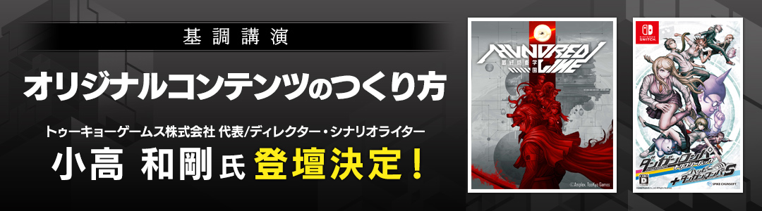 基調講演「オリジナルコンテンツのつくり方」では、『ダンガンロンパ』シリーズや『HUNDRED LINE -最終防衛学園-』などのタイトルを手掛けたトゥーキョーゲームス 小高 和剛氏が登壇。同氏の歩みを振り返り、新規IPを創出するための考え方や、具体的なノウハウが解説されます。
