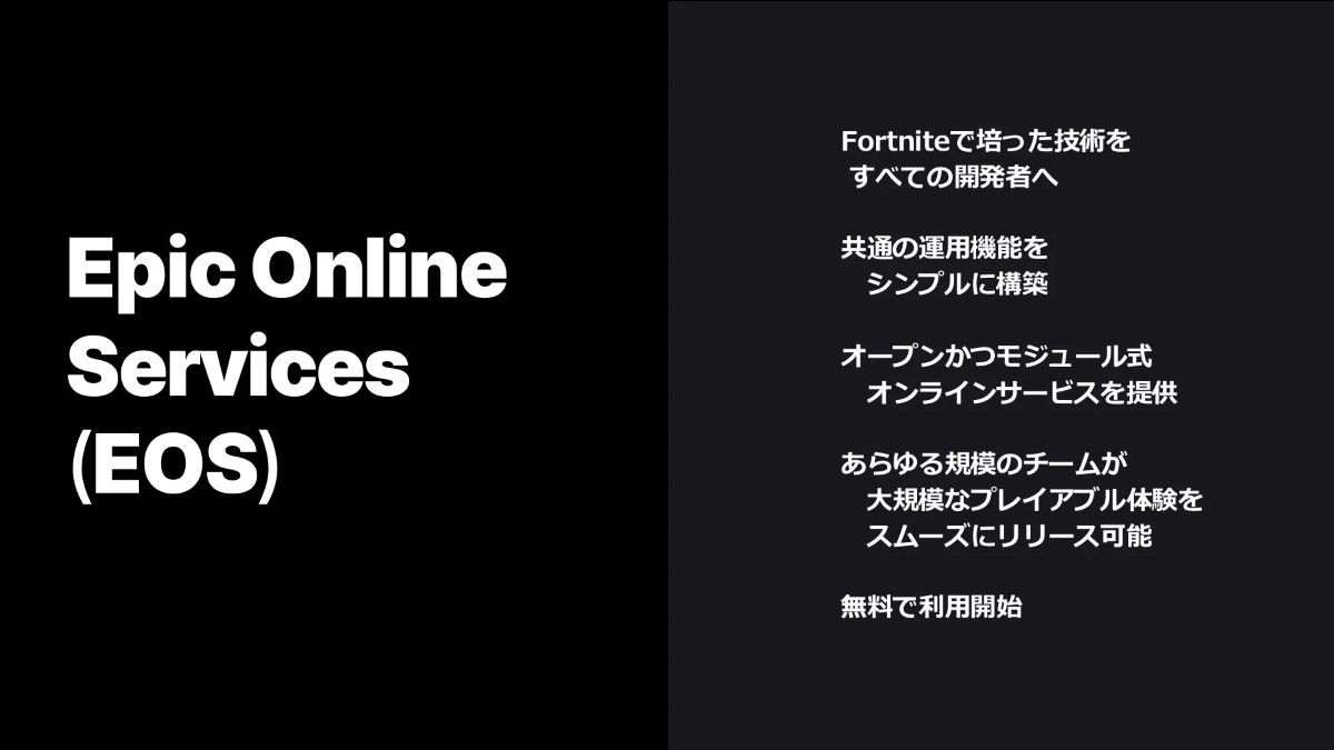 オンラインマルチプレイゲームの開発で活用できるサービス「EOS(Epic Online Services)」や、オンラインゲームの不正行為を対策するシステム「EAC(Easy Anti-Cheat)」を解説した「 名前だけ知っている人のためのEOS/EAC」(画像はスライド資料より引用)