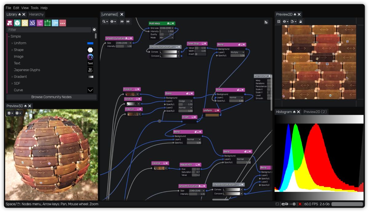 「Godot Engine」のGraphEditに基づくノードベースのUIを搭載。200種類を超える既存ノードを用いてプロシージャルなPBRマテリアルを作成できるほか、GLSLで独自のシェーダーを記述することも可能です。