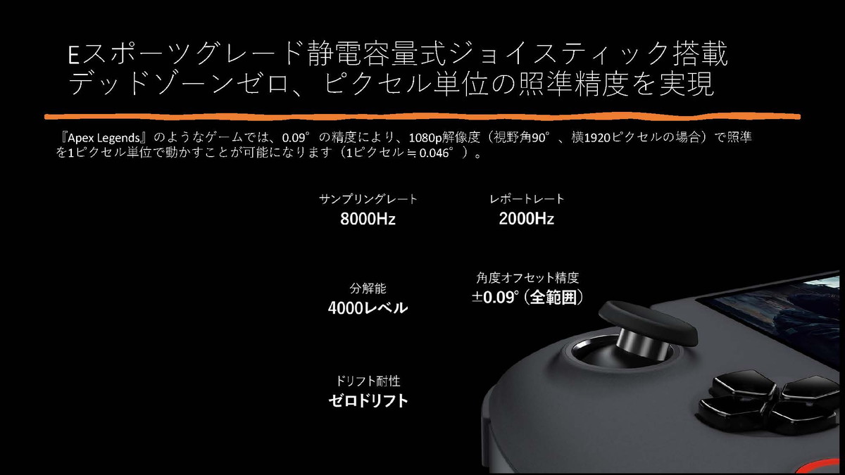 アナログスティックには静電容量式センサーを採用しており、GPD WIN 4と比べて、スティックやボタンのサイズも大きくなっている。実機を触った限りでは、操作感は格段に向上しており、家庭用ゲーム機に近いフィードバックが得られる印象だ。