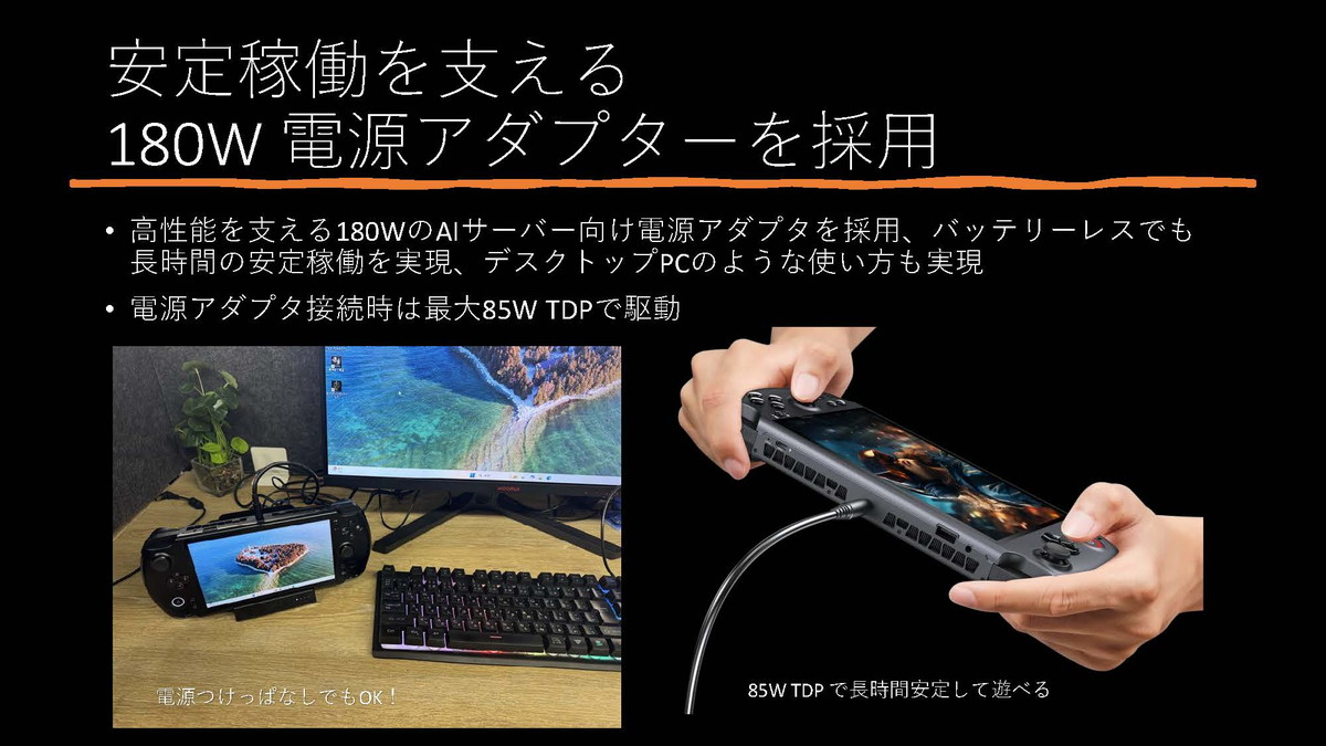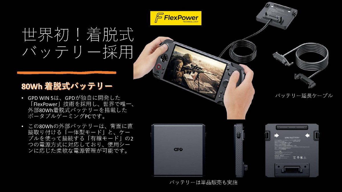 一般的なポータブルゲーミングPCは、内蔵バッテリーだけでは駆動時間が短く、結局ACアダプターにつなぎっぱなしで使うことが多くなる。それならば「いっそバッテリーを外付けにしてしまおう」という発想は、GPDらしい柔軟な設計思想の表れだろう。