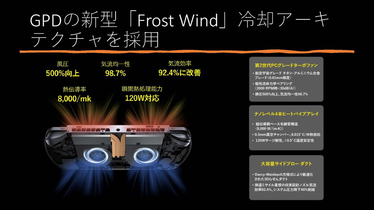 冷却システムは、デュアルファンとクアッドヒートパイプ、3Dらせんダクトなどによる新型の「Frost Wind」システムを採用し、高負荷時でも高い冷却性能を発揮。『黒神話:悟空』などのグラフィック負荷の高いゲームをプレイするとかなりの勢いでファンが回るが、ゲーム内のサウンドがあるため、プレイ中はあまり気にならない。