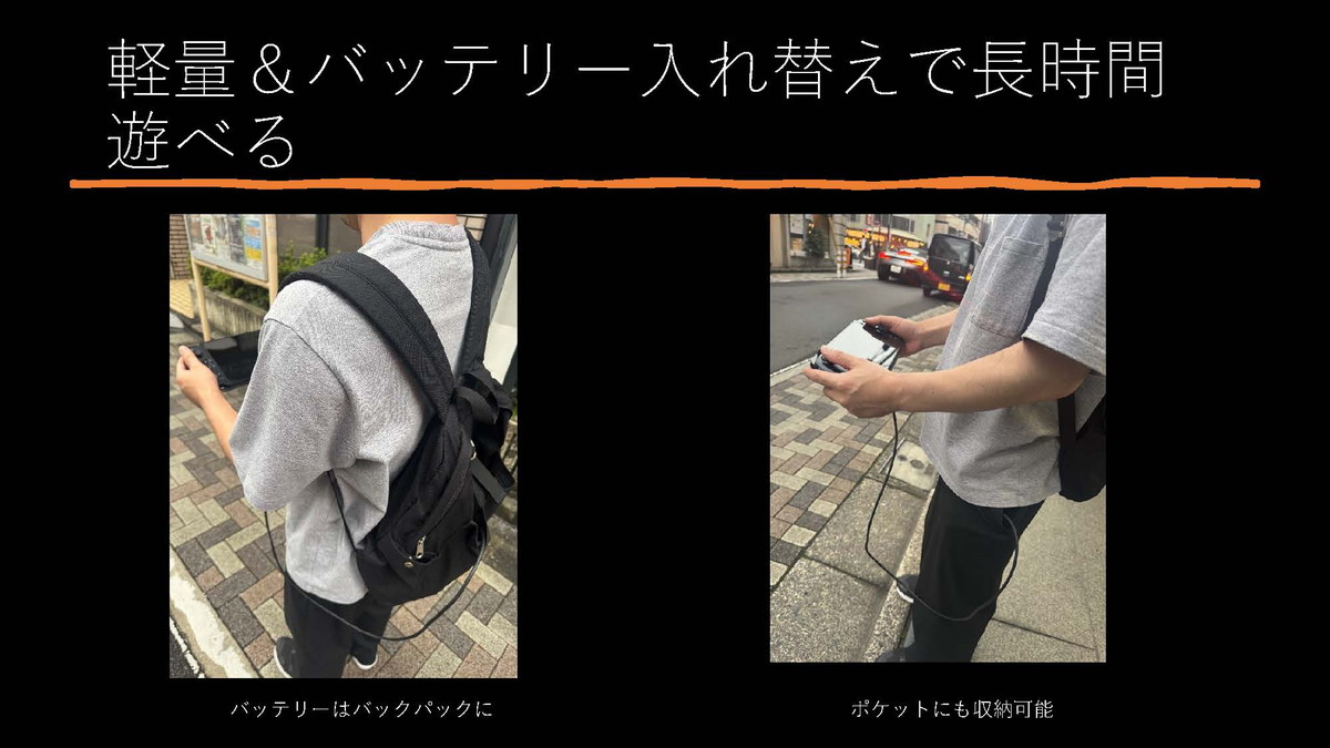 バッテリーは本体に装着するだけでなく、ケーブルを用いた接続も可能。これにより、バッテリーをテーブルの上に置く、ポケットやバッグに入れるなどして、手に感じる重さを軽減できる。