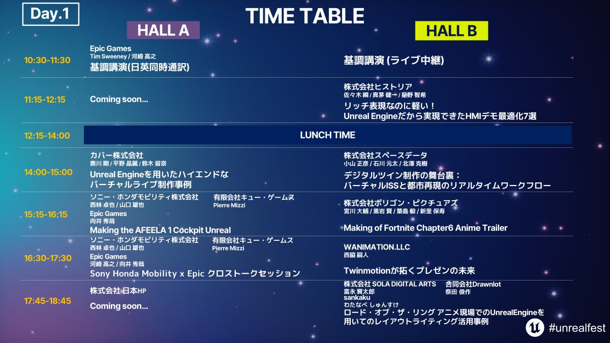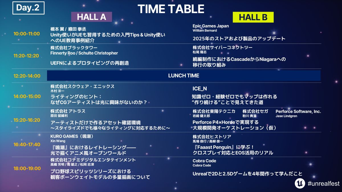 イベントでは、ゲーム/ノンゲーム分野におけるUE活用事例などを解説する全23講演が実施。講演のタイムテーブルはイベント特設ページで確認できます。