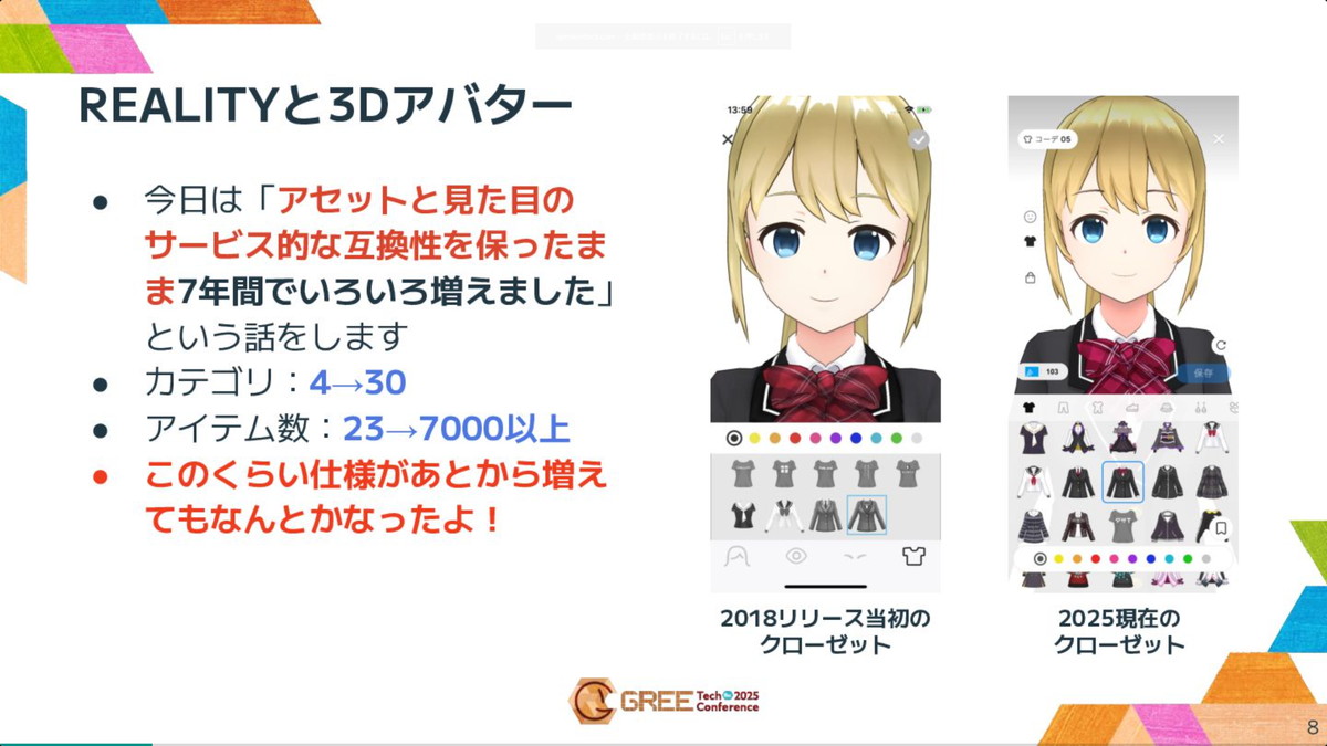 講演『「REALITY」3Dアバターシステムの7年分の拡張の歴史について」』で使用されたスライド資料の一部(画像はスライド資料より引用)