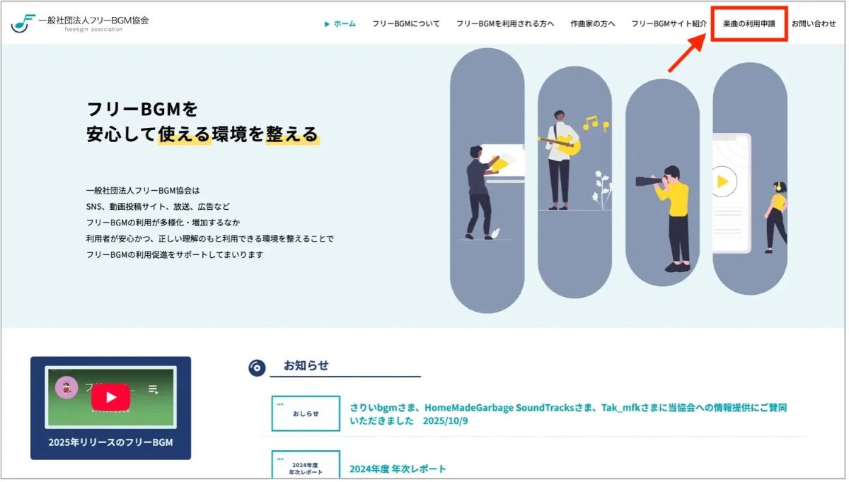 フリーBGM協会公式サイトのトップページ右上(画像の赤枠部分)に専用フォームのリンクが掲載されている(画像はフリーBGM協会公式noteより引用)