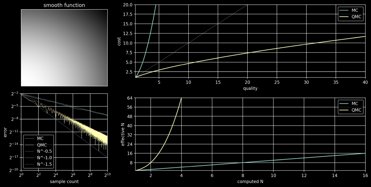OpenQMCでは、モンテカルロ法と比較してノイズの収束率が向上する準モンテカルロ法を起用しており、Framestoreは解析例を通じて、サンプル数が少ない状況でのノイズ低減と効率改善が期待できると述べています。