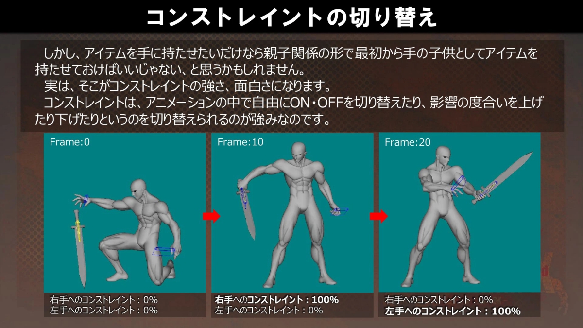 アニメーション中にコンストレイントを切り替え、剣を右手から左手に持ち替えるといった動作も実現できる(画像はスライド資料より引用)