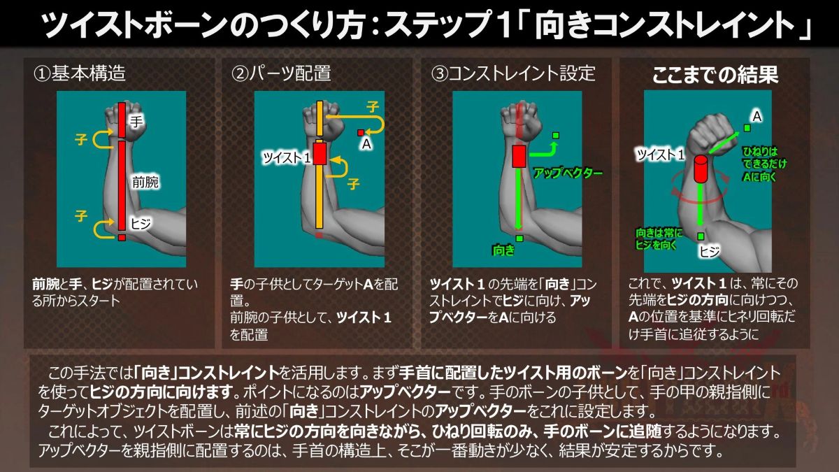 コンストレイントの応用技法として、関節を曲げた際に体の一部が不自然に歪んでしまう現象を防ぐ方法や、腕を捻る動きを綺麗に表現するために用いるツイストボーンの作成方法などを紹介しています。