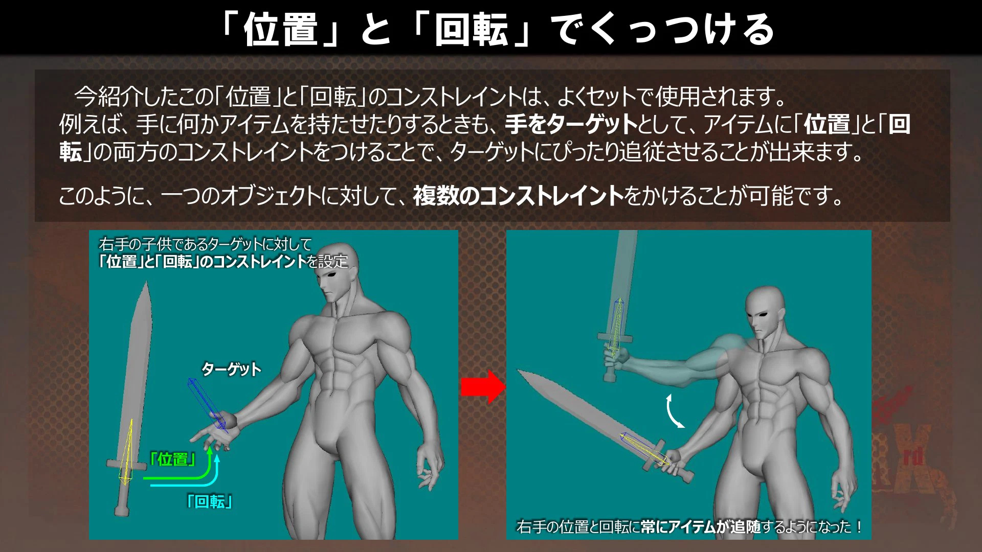 「位置」と「回転」のコンストレイントを併用して、剣を手に追従させることが可能(画像はスライド資料より引用)