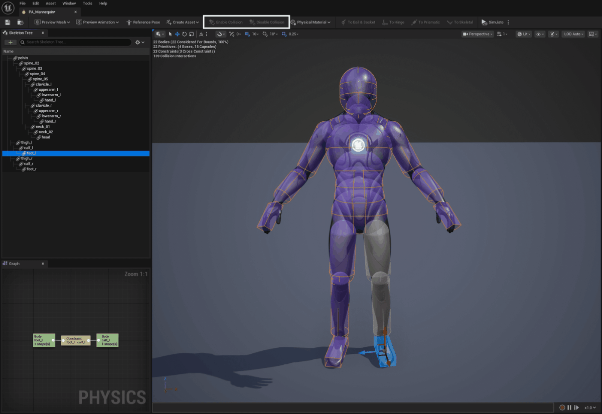 ラグドール物理において、関節の可動範囲の都合上胴体と接触しない部位(腕の付け根や太ももなど)のコリジョンを無効化することで処理負荷を軽減できる(画像はブログ記事より引用)