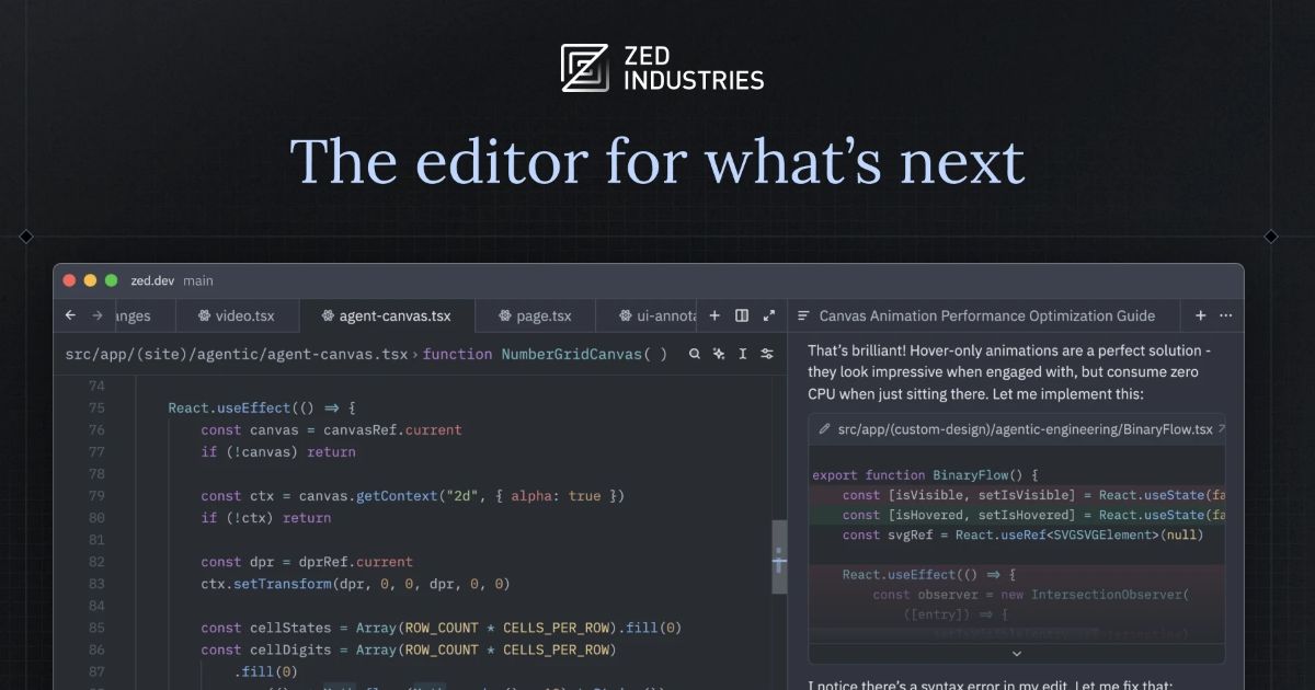 ZedのAIコーディングサポート機能を紹介するイメージ動画(動画は公式サイトより引用)