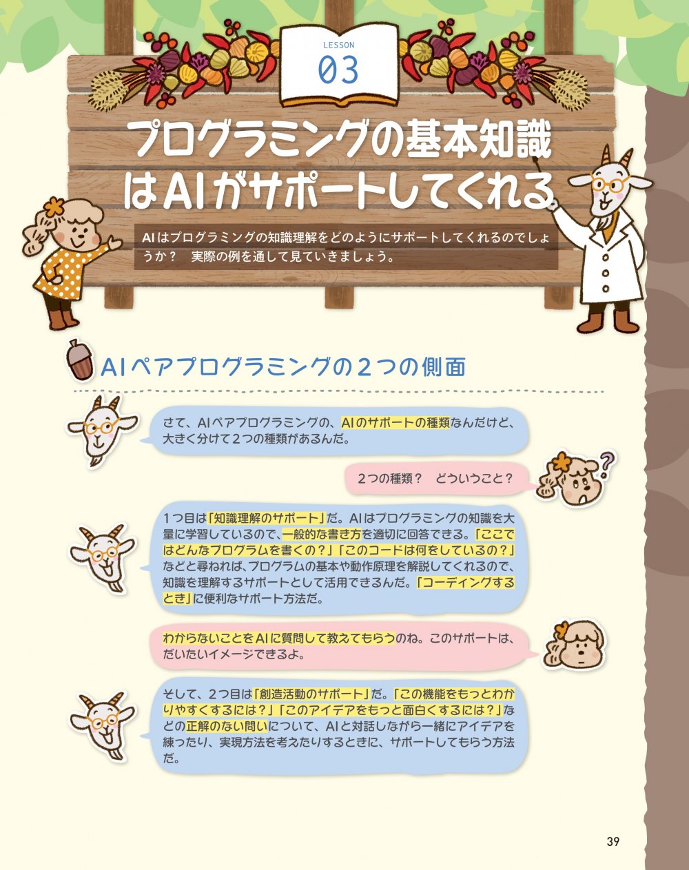 チャットボットと会話することでアイデアを整理・ブラッシュアップする方法や、AIによるプログラミング支援機能の利用方法などを学習できます。