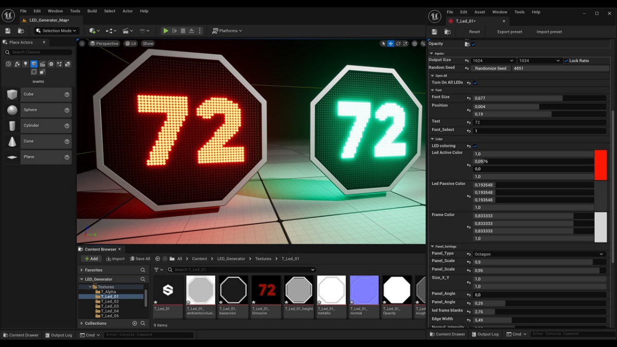 LEDの電飾看板を作れるアセットです。ライトは色や点滅などを設定可能。フレームの形状は、正方形や円形など4種類が用意されています。