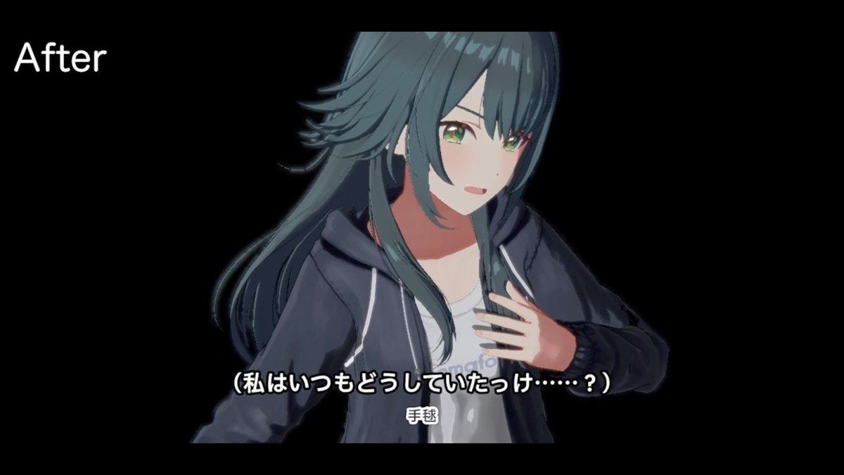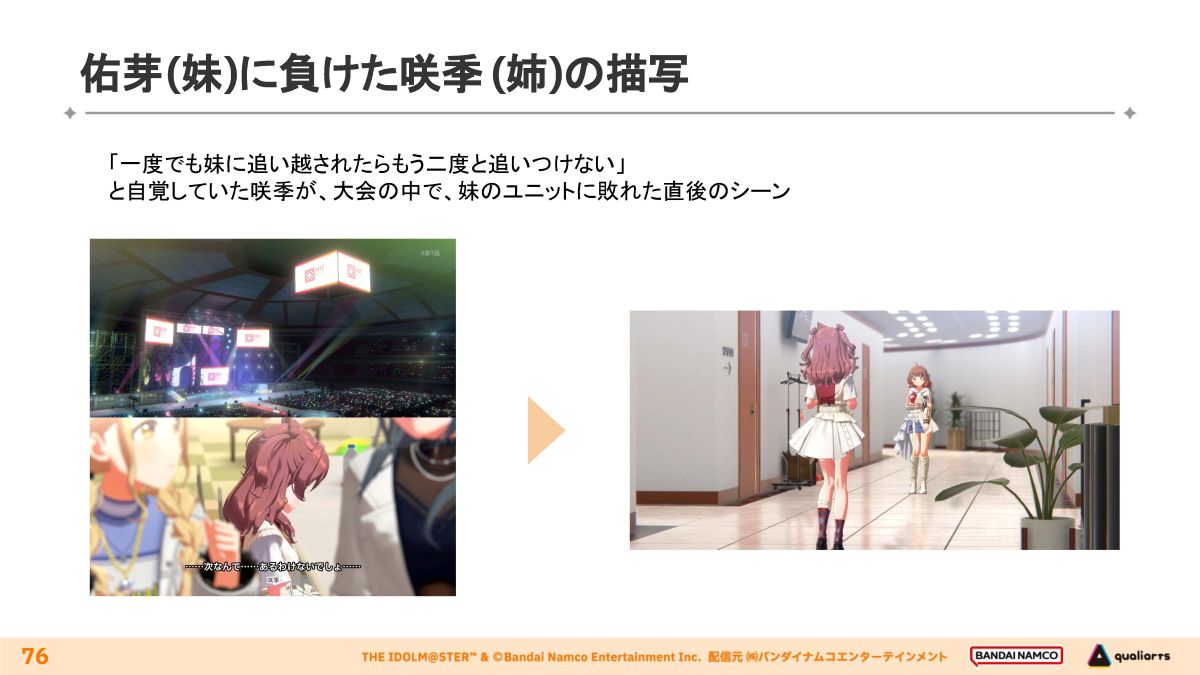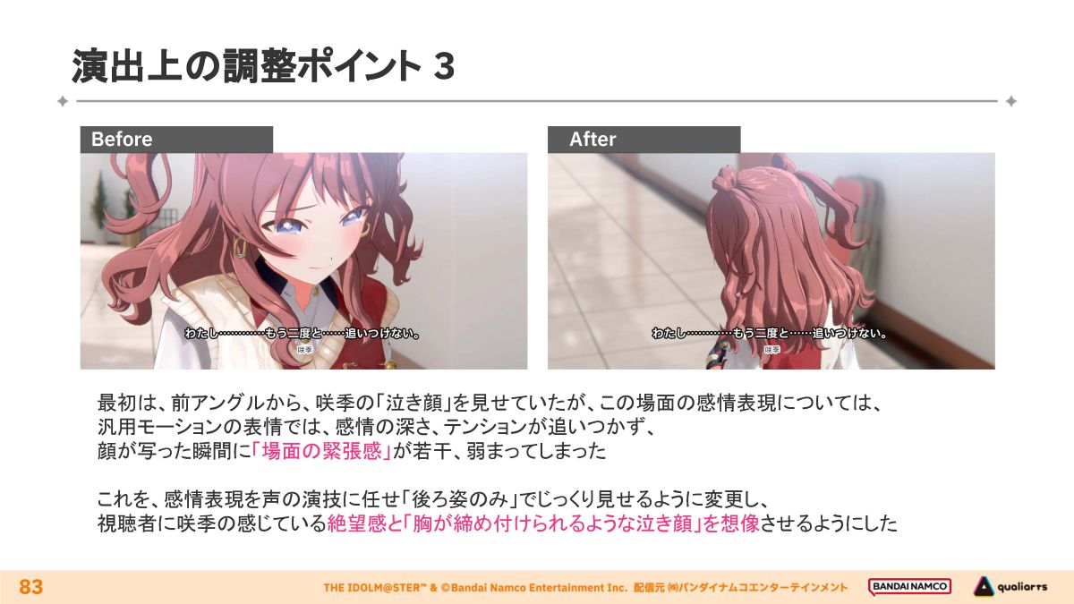 当初は咲季の泣き顔を正面から捉えていましたが、強い覚悟が叶わず敗れてしまった苦しさや、感情の揺れ幅を汎用モーションだけでは表現できなかったため、後ろ姿で嗚咽や苦しみ、絶望感を伝える演出に変更しました。