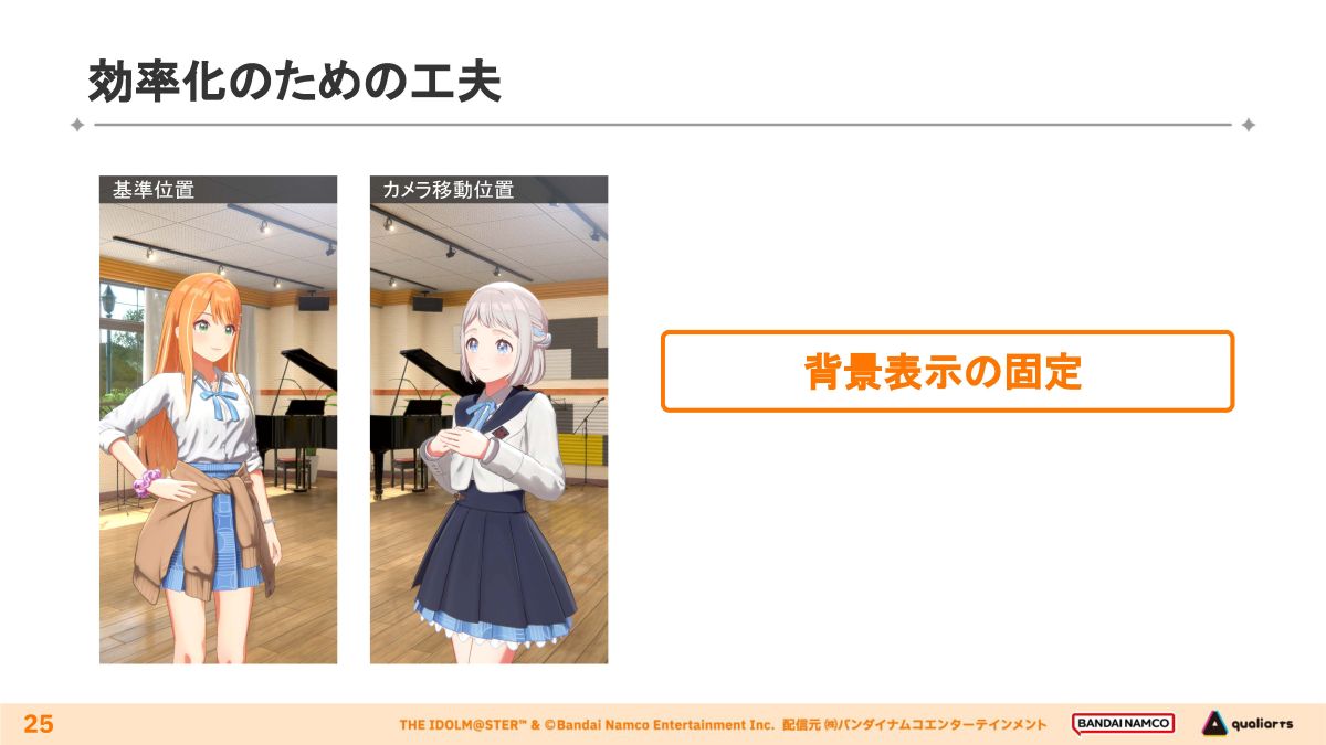これだけの物量をハイクオリティに作るため、アイドルの立ち位置やカメラワーク、背景表示を固定することで映像制作の効率化を図っています。