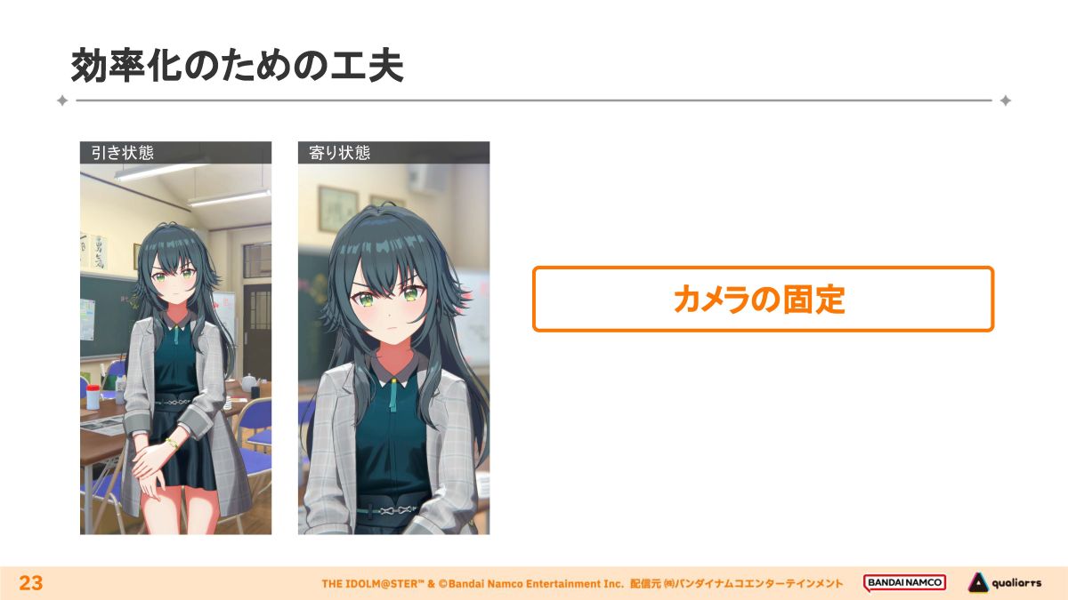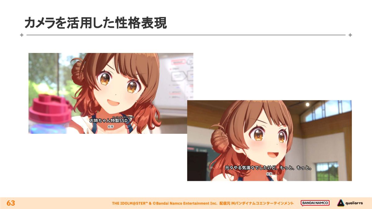 その後の量産化の段階では、演出の指針となるVコンを作成し、それを杉村氏がディレクションしながら演出を固めていきました。ひとつひとつのコミュ制作の中から見出された共通の要点などをチーム全体で蓄積することで、精度を上げていったそうです。