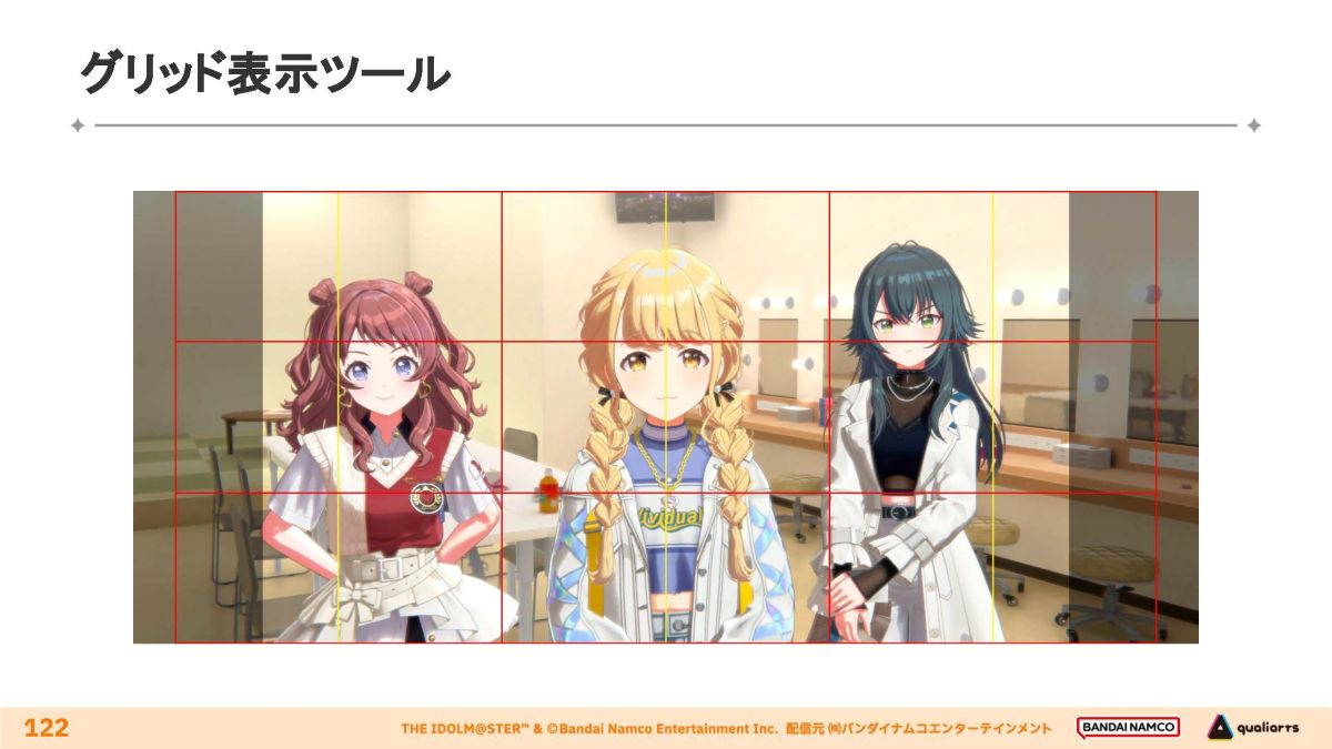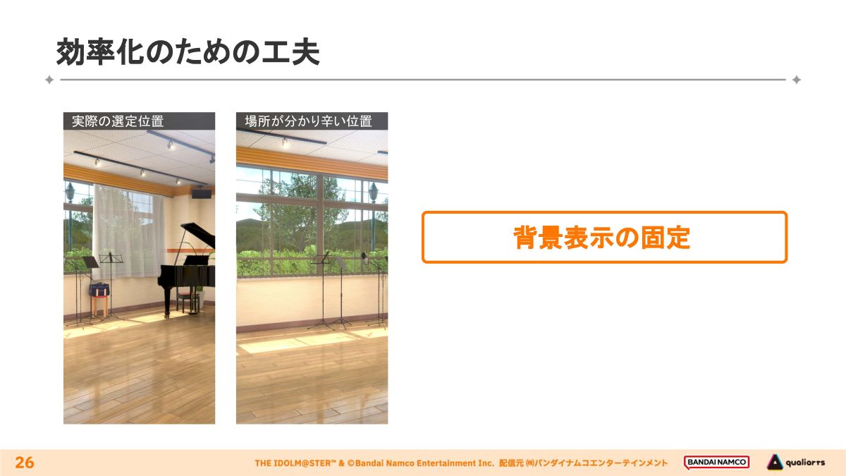 アイドルの立ち位置に合わせて、背景の構図に基準を設ける。複数のアイドルが登場するシーンではカメラを左右にパンすることで対応する