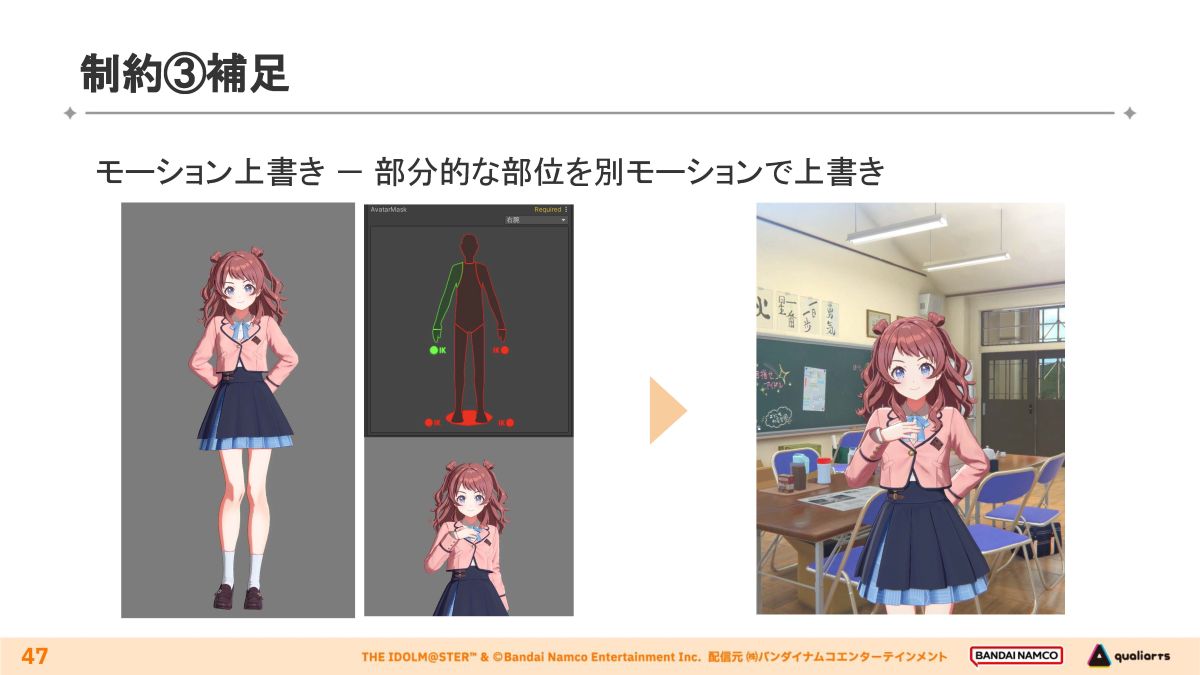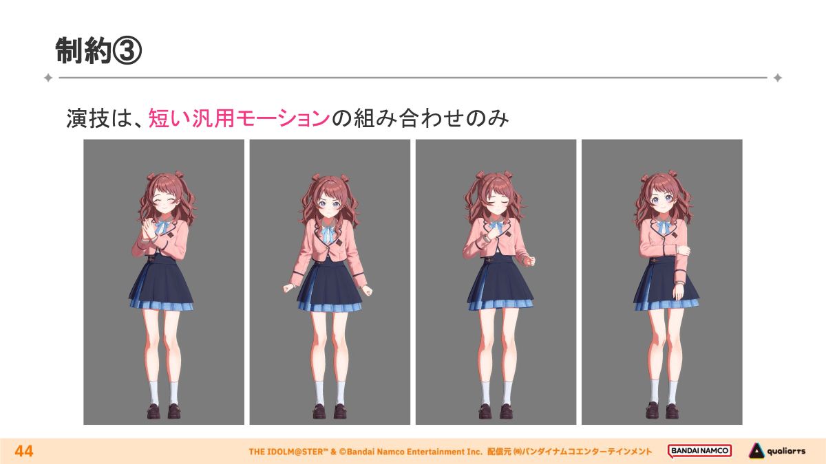 スケジュールと工数の都合でシーンごとに演技を収録できないため、短い汎用モーションを組み合わせ、補間で演技に仕上げています。