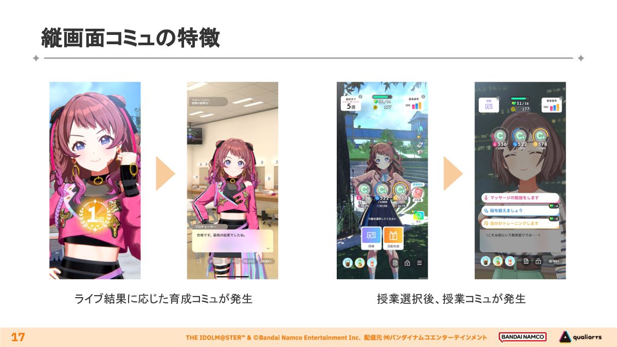 ひとりひとりのアイドルの成長に応じて段階的に縦画面コミュが発生することで、プレイヤーはプロデューサーとしてより深く世界観に没入できるように演出されている