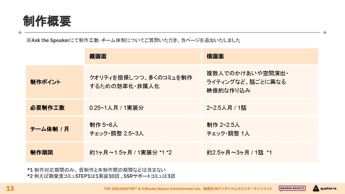 縦画面コミュはテンポ感やカジュアルさを重視して、多数の物語をコンスタントに作り出す体制を構築。対して横画面コミュはアニメ作品と同等のクオリティを目指し、各話を作り込むことに特化しています。