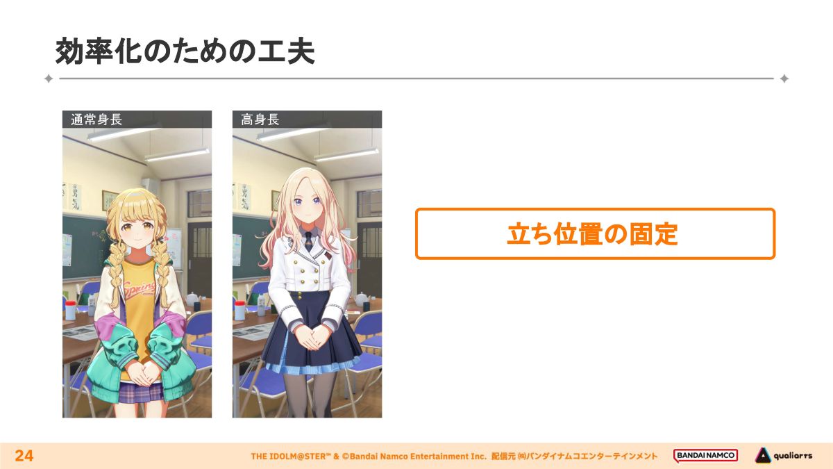 アイドルの立ち位置は、身長に応じて2パターンを使い分け、アイドルの登場人数やモーション内容などを踏まえて適宜調整している