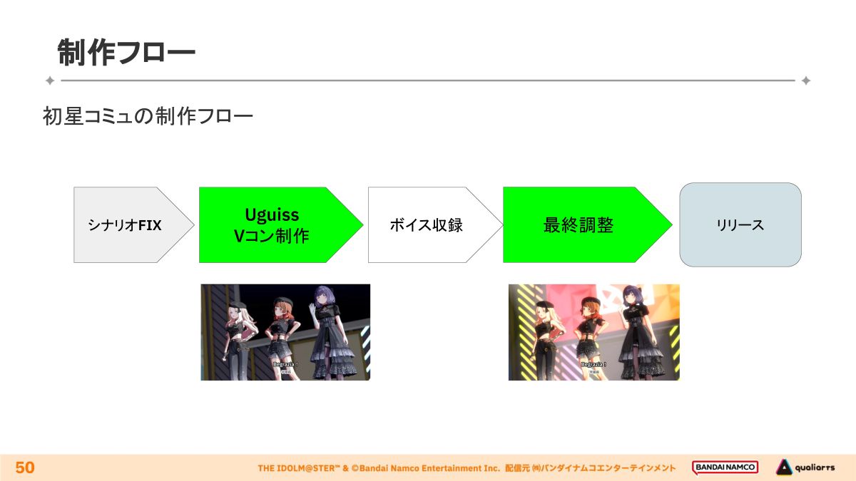 「初星コミュ」の実制作に着手したタイミングはほかのコミュよりも遅くなり、リリースまであと1年を切った頃に開始したため、それに対応する上でも現在のワークフローが適していたという