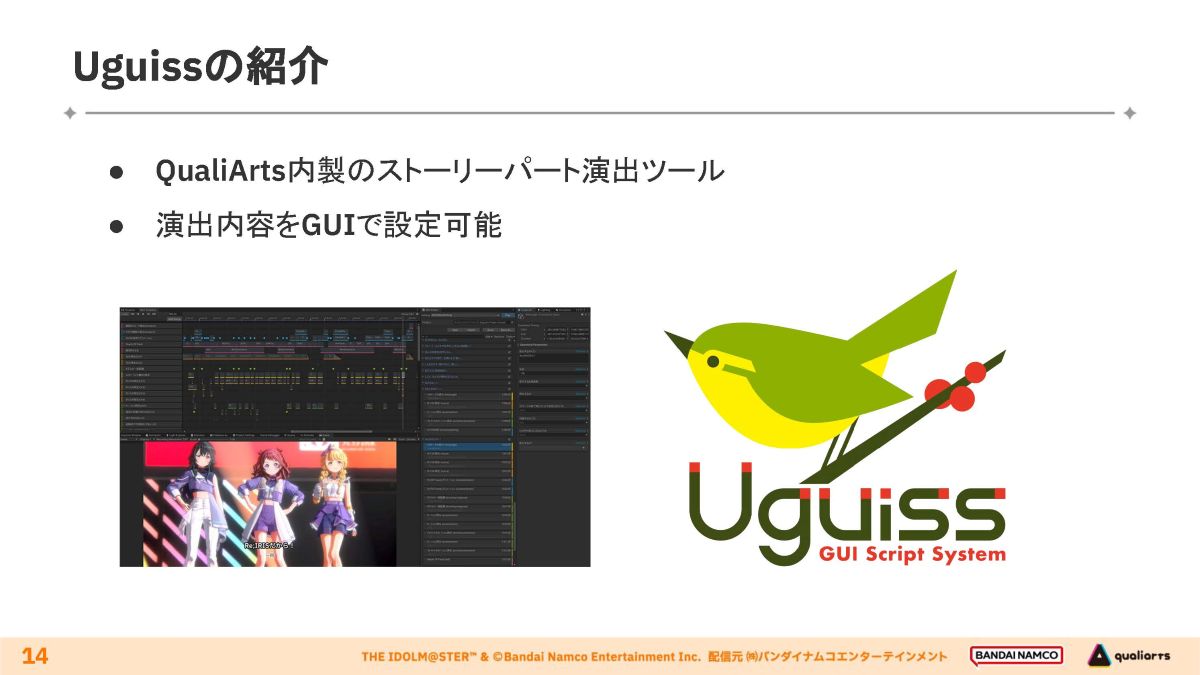 アニメ作品と遜色のない映像表現を追求した「初星コミュ」。これらは前述の通り同社内製ツール「Uguiss」で制作されています。