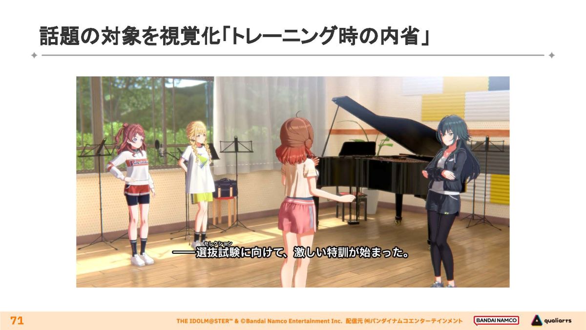 プレイヤーにより鮮明なイメージを想起させる手法について、手毬がライバルの佑芽にボイストレーニングを行う際、手毬が教え方を考えるために普段自分が歌っている様子を回想するシーンを例に説明されました。