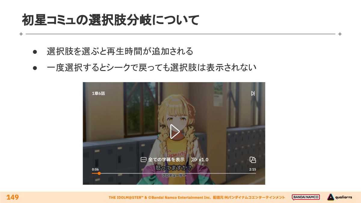 加えて「初星コミュ(映像再生方式)でも分岐を実装したい」という要望に応えるため、映像再生/インタラクティブ双方の制作環境を統一した上、映像再生方式においてもインタラクティブな挙動を実装可能とする方針に決まりました。