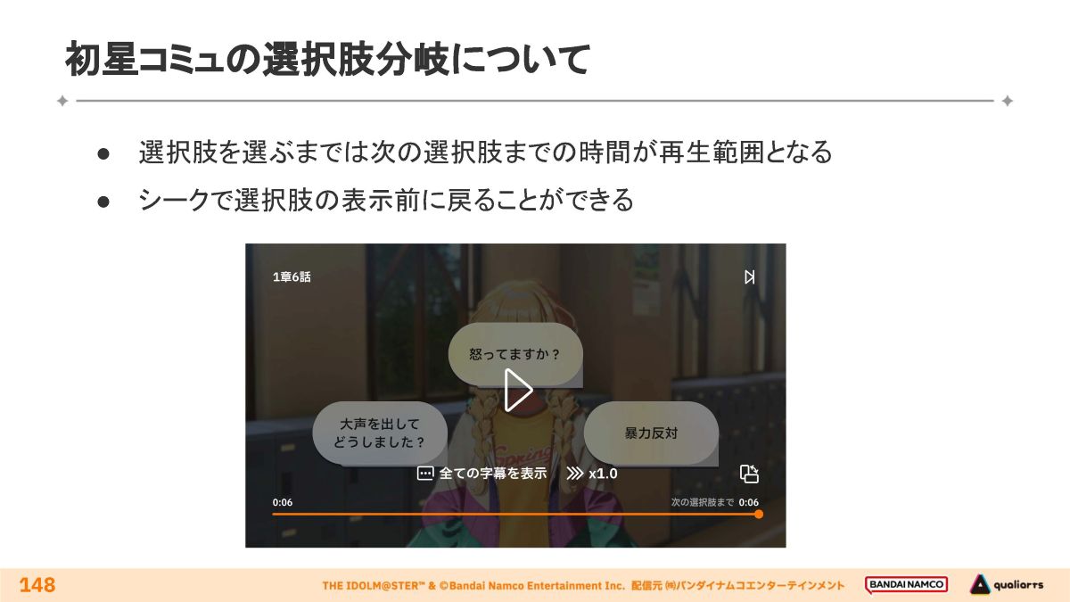 「初星コミュ(映像再生方式)」は、選択肢による分岐とシークバー操作を両立しています。