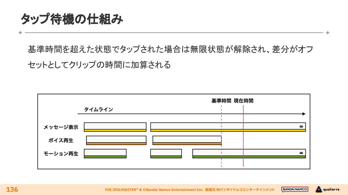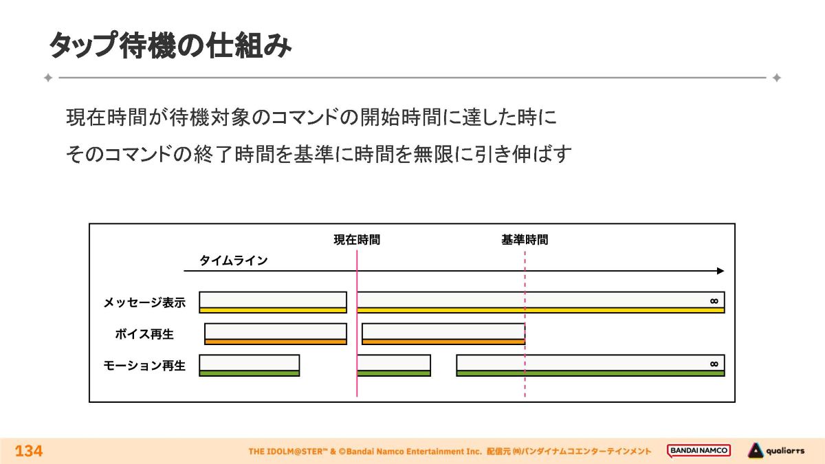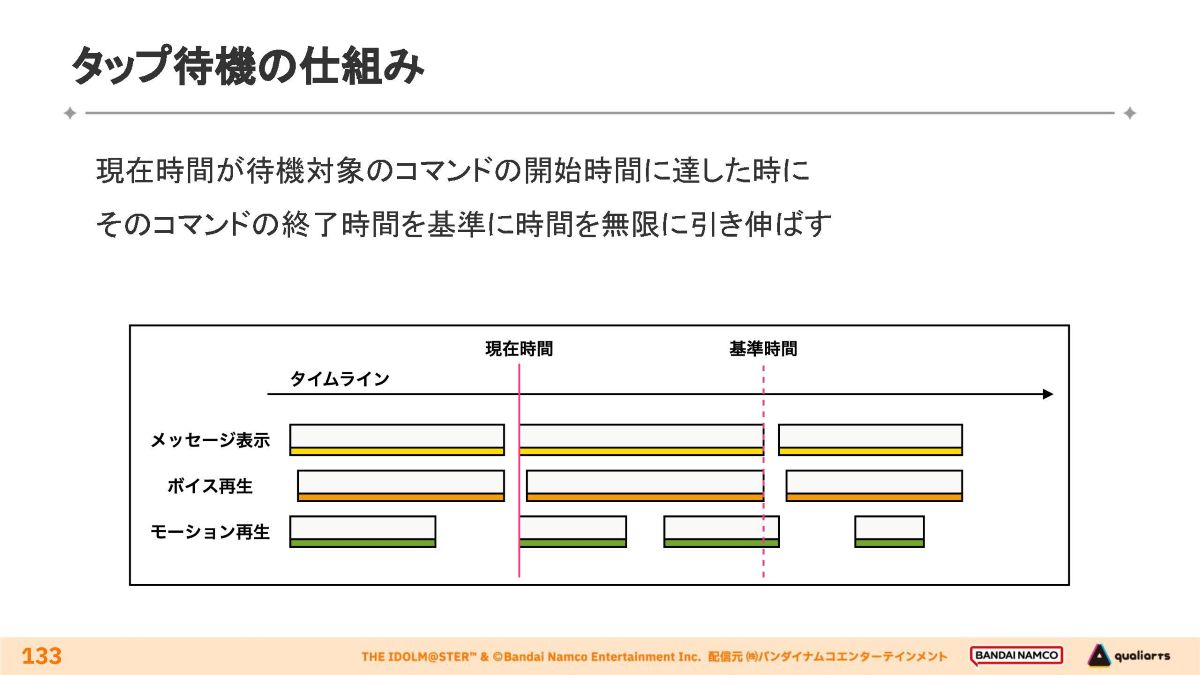 タイムラインの現在時間が対象コマンドの開始時間に差し掛かると、そのコマンドの終了時間(基準時間)と同時あるいはそれ以降に終了する演出は終了時間が無限に引き延ばされ、待機中に継続して再生されます。