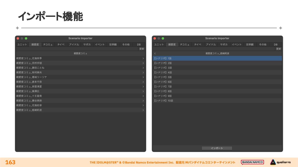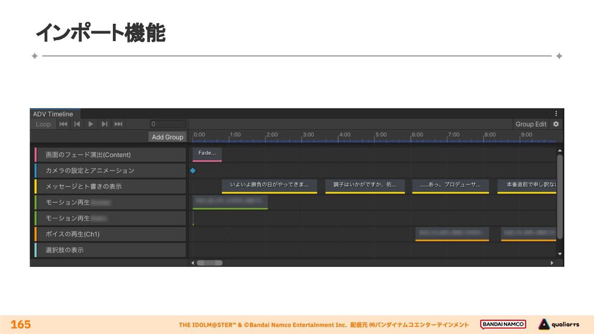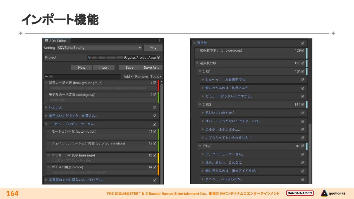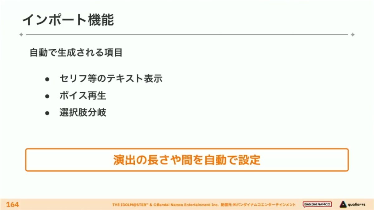 「どの話者の何番目の台詞か」といった情報からボイスのアセットIDが自動で決定され、実際のボイスの長さを取得する。分岐の入力は仕組み上複雑であるため、インポート時点で負担軽減の工夫が行われる