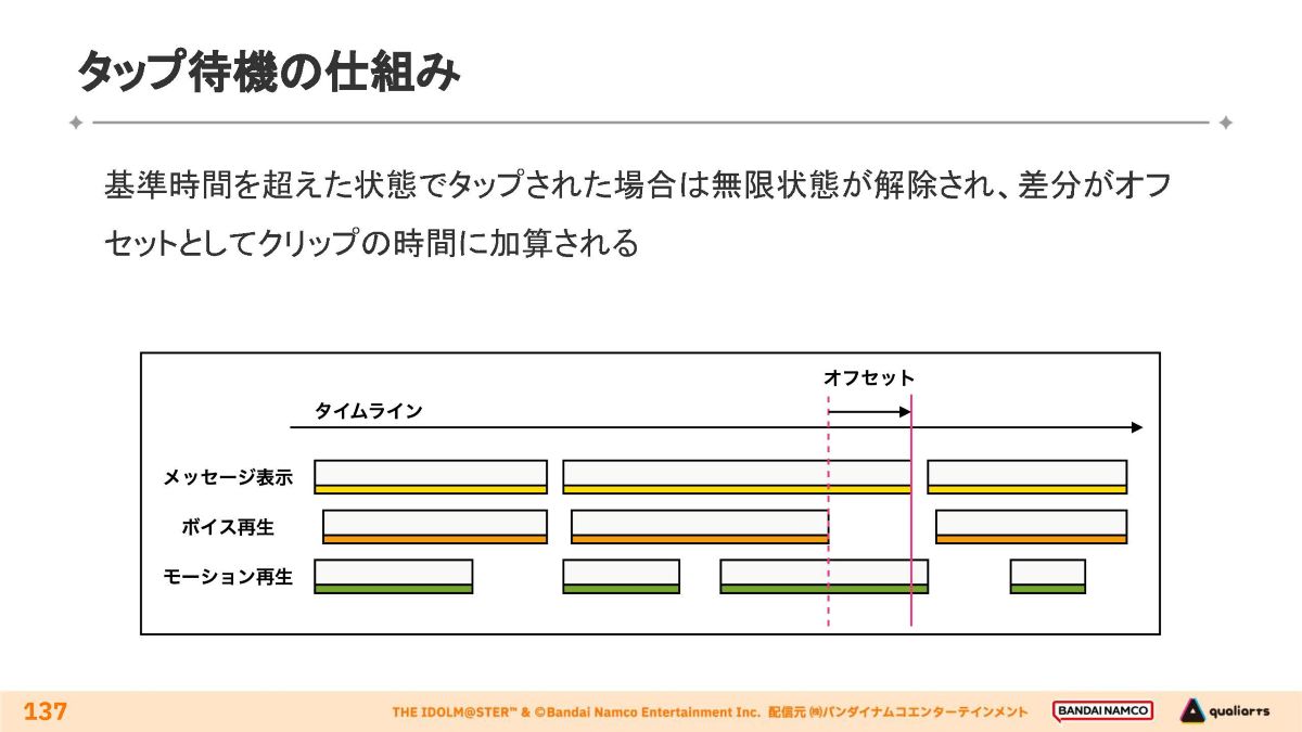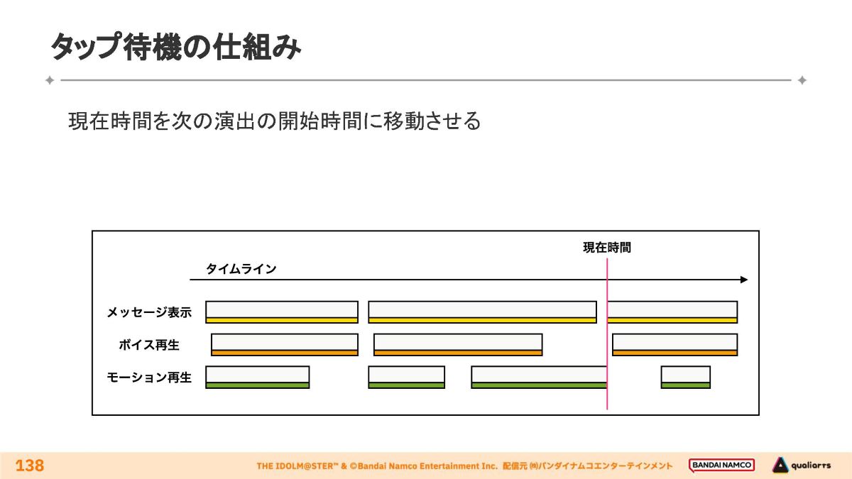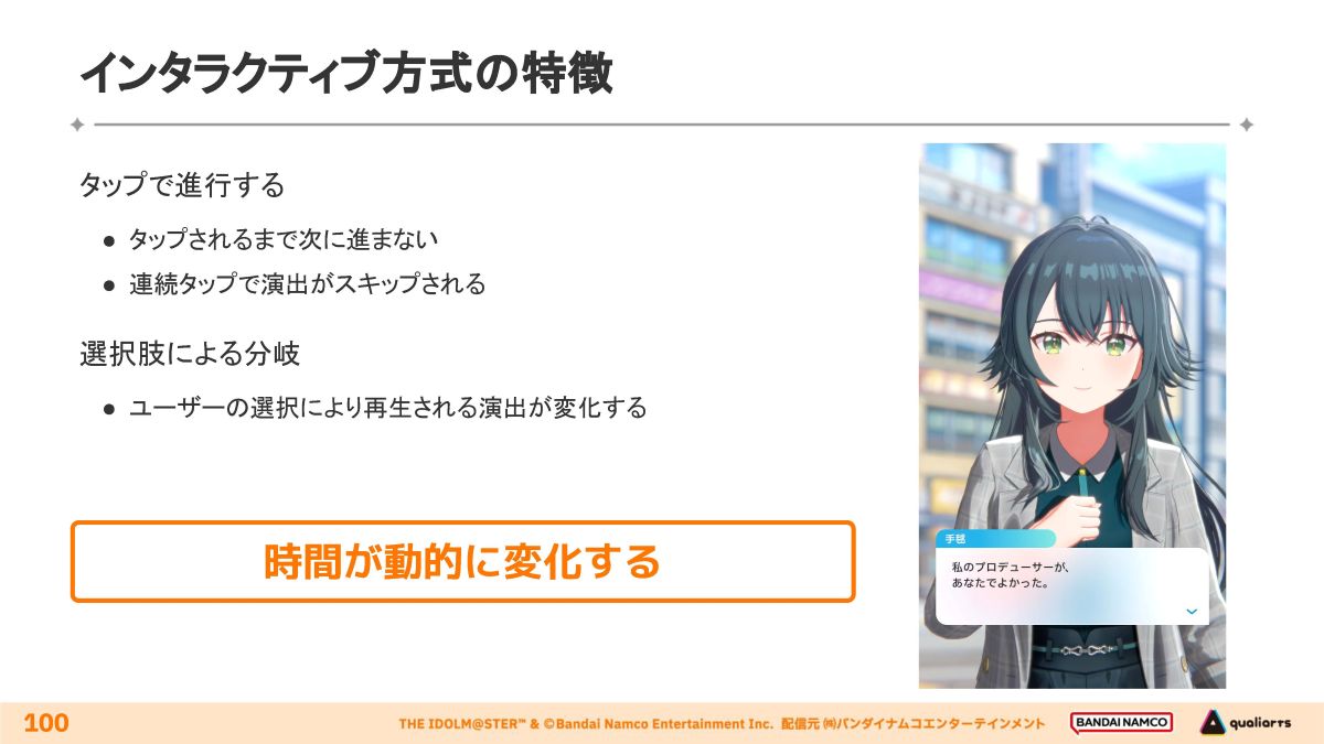 「初星コミュ(映像再生方式)」のインタラクティブな挙動として、画面がタップされたタイミングに応じて演出の開始/終了時間が変動する「タップ待機」と、演出の分岐という2種類が実装されています。