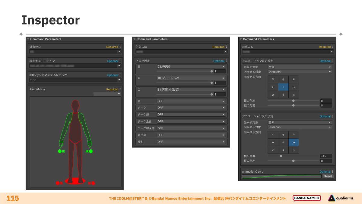 コマンドのパラメータを調整するツール。演出のタイミングは主に「TimelineEditor」で視覚的に調整しますが、「Inspector」上で数字入力による調整も可能。コマンドごとに編集機能をカスタマイズできることが特徴です。