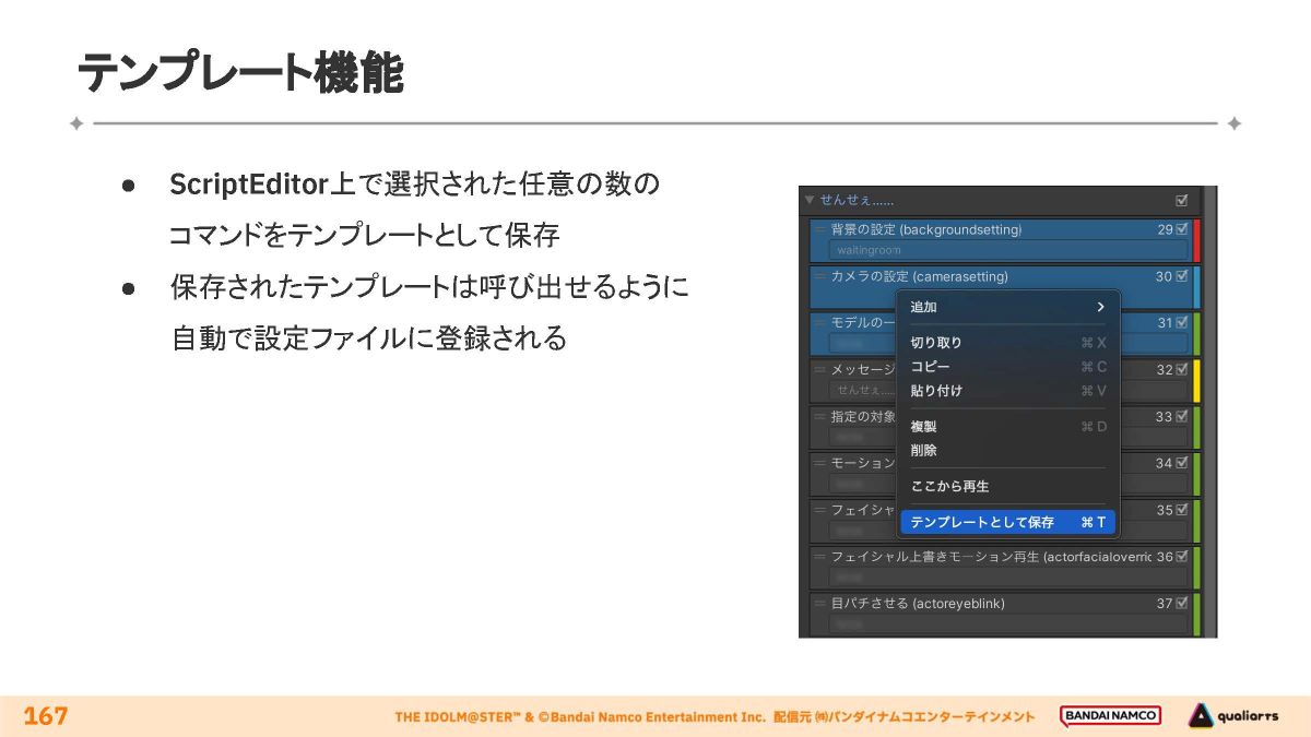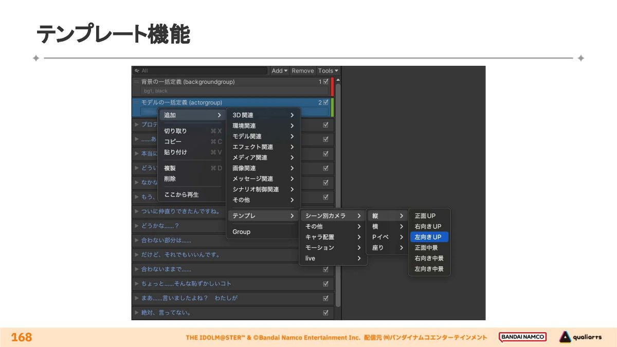 コミュの量産化を支えるための工夫として、Unity上で動作する独自開発ツール・機能4種類が紹介されました。