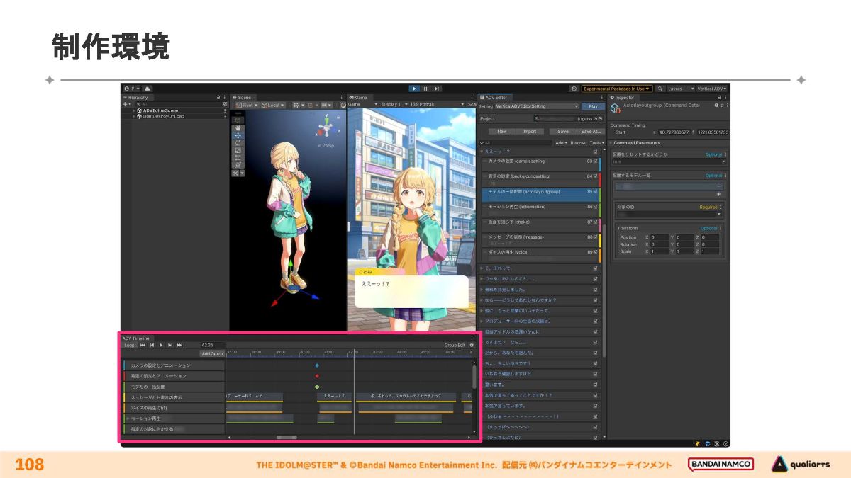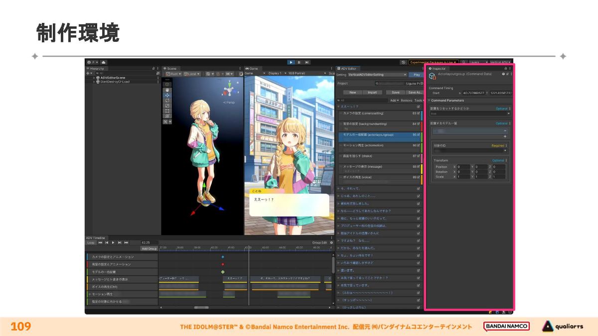 コミュの再生システムは基本的にUnityで実装しています。実装環境は、映像制作面で利点の多いタイムライン方式を採用しています。