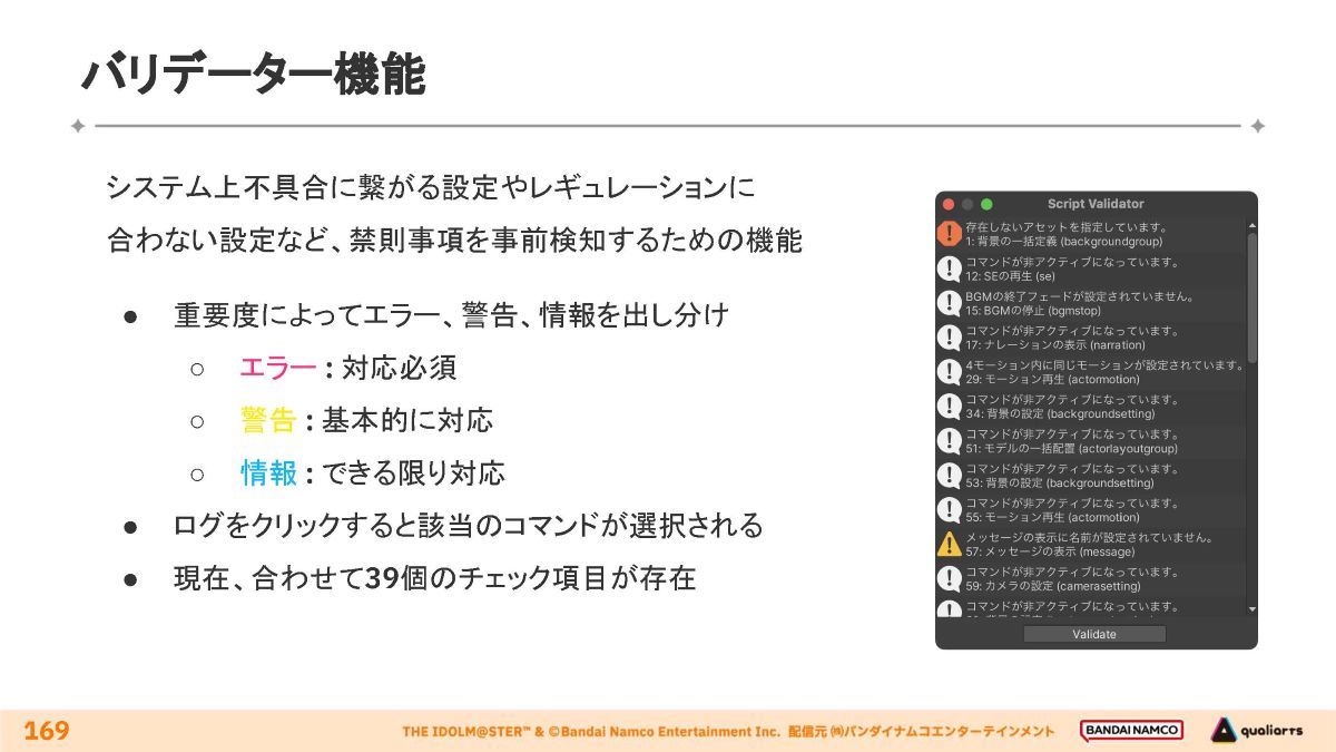 存在しないアセットの指定・同じモーションの連続使用といった事象を調査し、重要度によって「エラー」「警告」「情報」の3パターンで報告。
