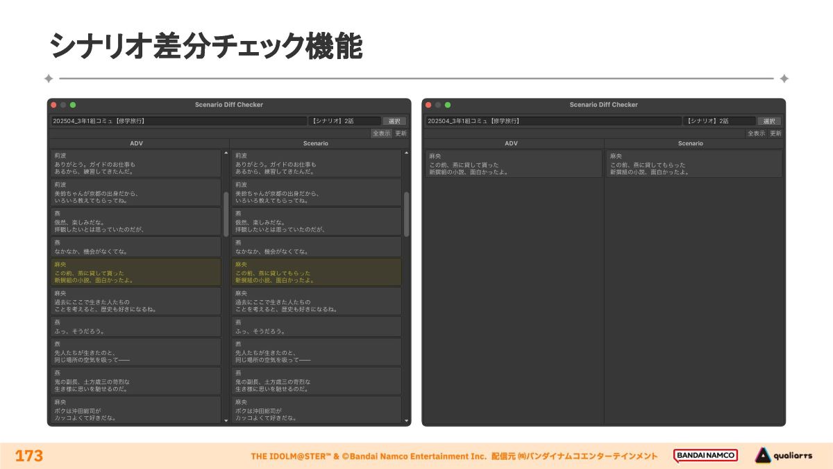 スクリプト制作後にシナリオを調整(誤字脱字や漢字の閉じ/開き、ボイスと一致しない箇所の修正など)した際、それらがスクリプトへ反映されているかチェックすることなどを目的に、スクリプトとシナリオの差分を検出できるツールが用意されました。