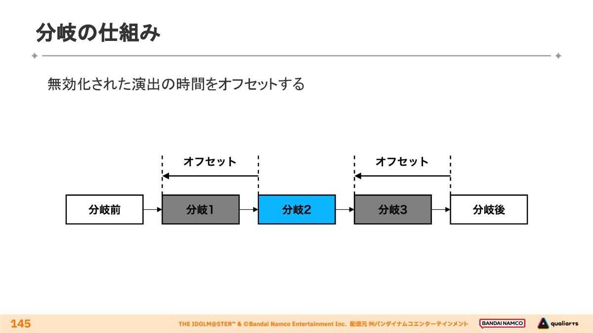 分岐1→2→3と直列で並ぶ演出から分岐2を選択すると、分岐1・3は無効化され、本来再生されるはずだった演出の時間が取り除かれる