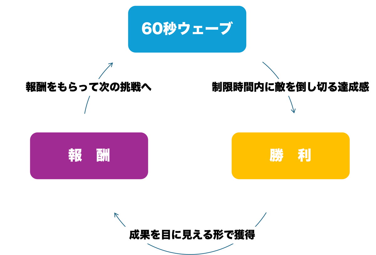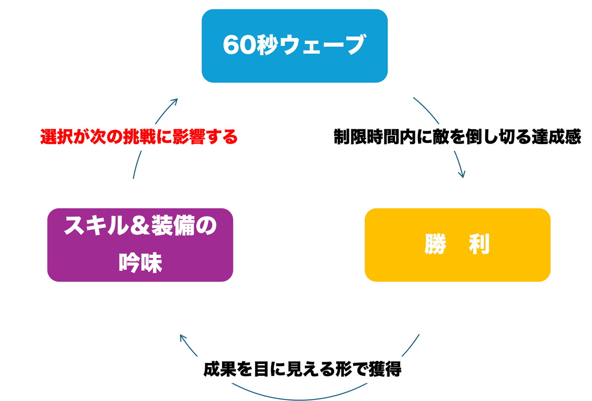 1回目のレビューの時に「60秒ウェーブ→勝利→スキルと装備の吟味」というプレイサイクルを確立させました。