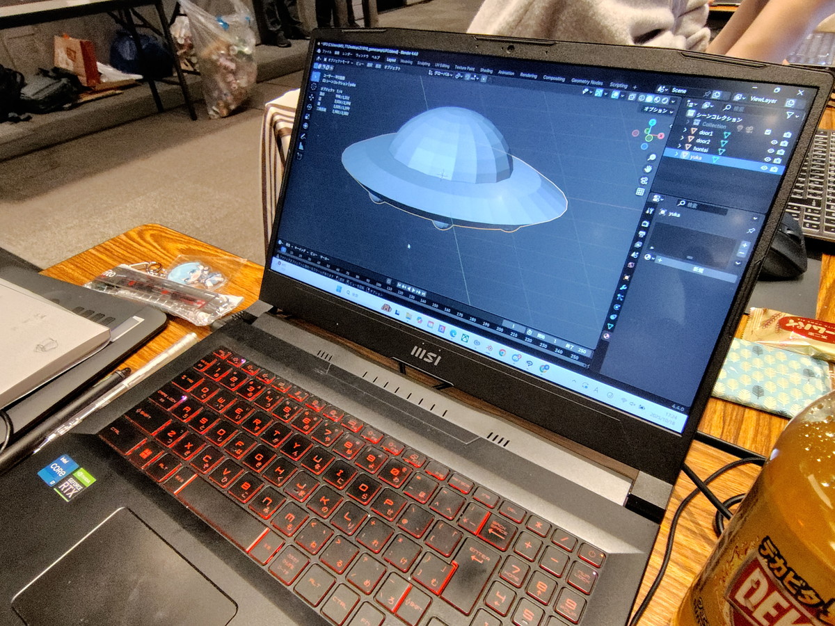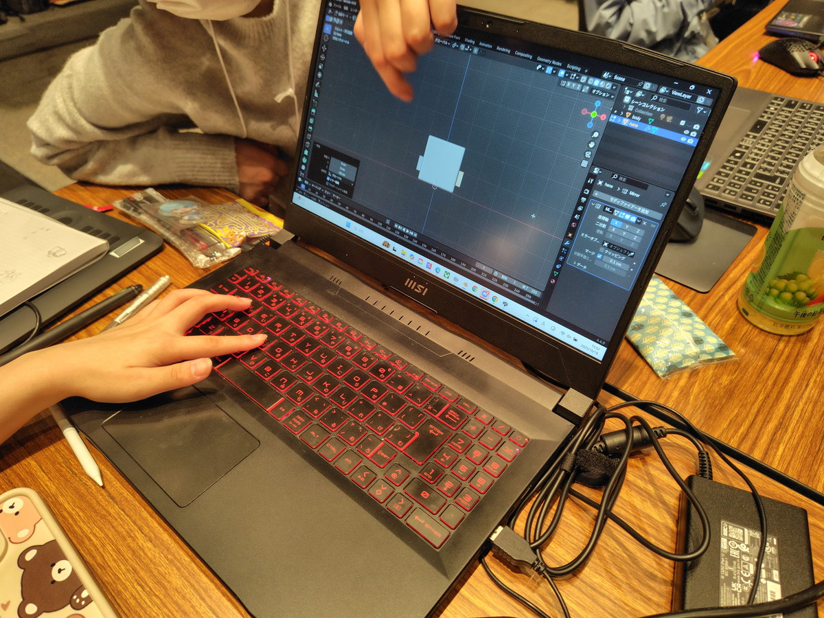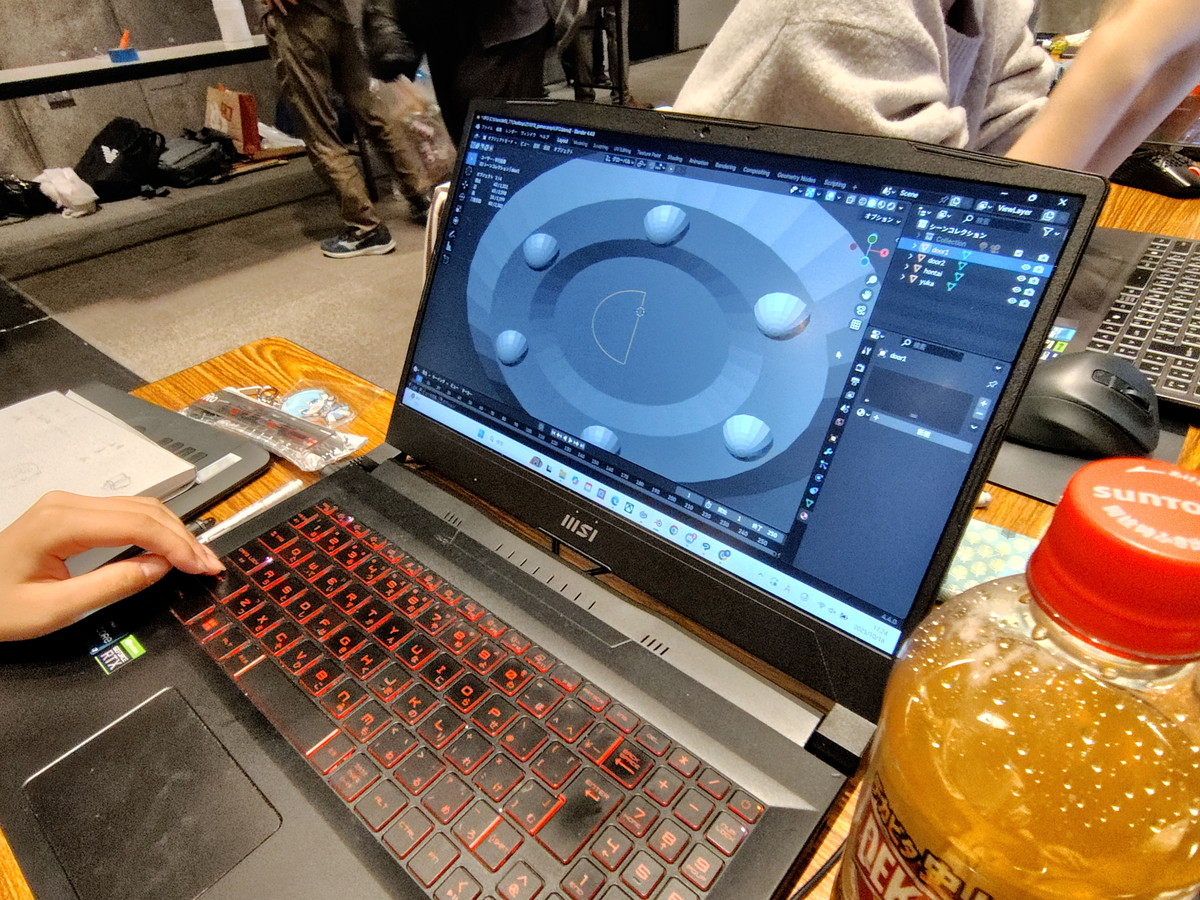 3DデザイナーはUFOの3Dモデルの内部構造や、ウェイト設定を調整します。Unity上で動作確認をしてはBlenderも使って調整を繰り返し、各担当が粘り強く作業を続けていました。