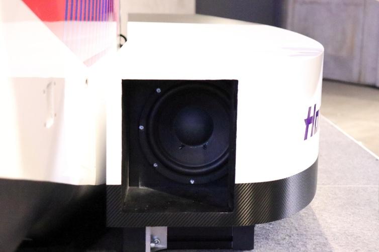 新たに披露された「Honda eMS SIM-01」特徴として音響面のアップデートが何度も挙げられていましたが、スピーカー位置はドライバーの周囲を囲むように前後左右4つ配置されています。さらにロードノイズなどの低周波を再現するために、サイドポンツーン(レーシングカーのコックピット両脇に張り出した部分)内部にサブウーファーを内蔵しています。