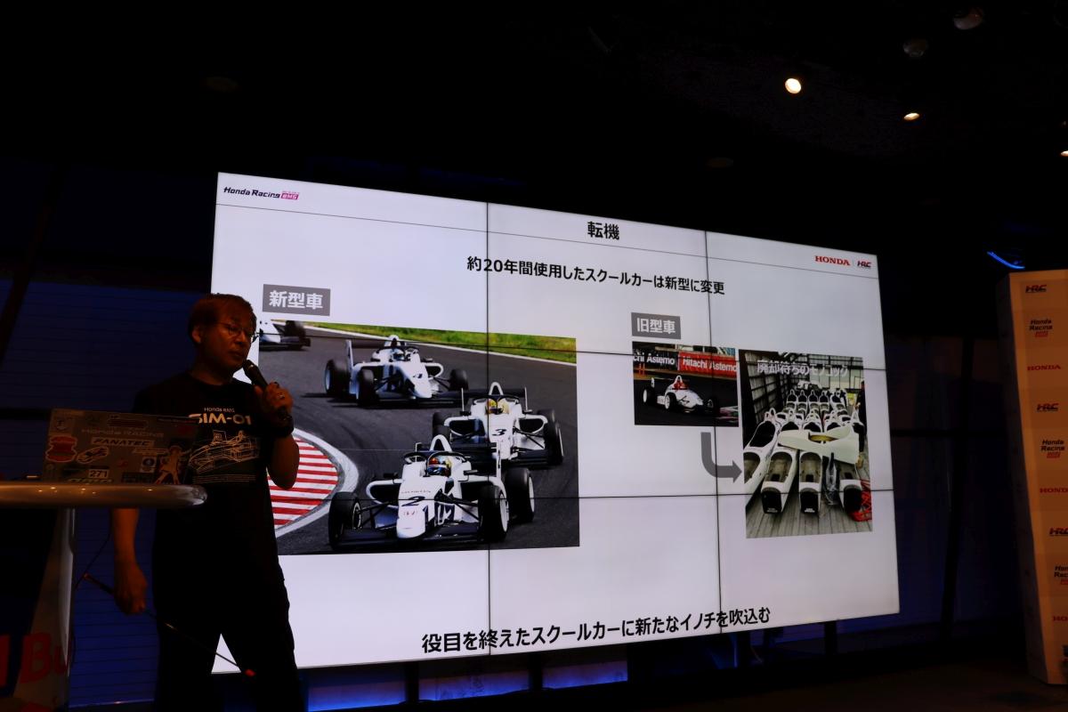 HRSで約20年間にわたって使用されてきたスクールカーである教習用フォーミュラーカー「童夢SDH-F04」が処分され、旧型車両は廃却を待つだけのフルモノコックの山になる、という情報を手にした岡氏は鈴鹿に急行。これらの車両を廃棄してしまうのはもったいないと強く感じたことから、役目を終えたスクールカーに新たな命を吹き込むプロジェクトが始まったとのこと。これが「Honda eMS SIM-01」に繋がります。